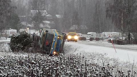 Web En buss med ett 40-tal personer ombord välte i diket i Torsby kommun i norra Värmland på söndagsförmiddagen.